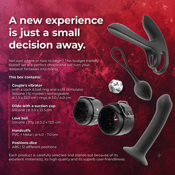 Das exklusive Couples Love Toy Starter Set Together von Magic Shiver mit 5 ausgesuchten hochwertigen Qualitäts-Produkten inspiriert Paare zu neuen Intim-Abenteuern. 3 raffinierte Silikon-Toys, weiche Handfesseln und ein Liebeswürfel laden zum lustvollen Experimentieren und zu intensiven Höhepunkten ein. Die anwenderfreundlichen Toys sind optimal für den spielfreudigen Einstieg in die Welt der Intimspielzeuge.